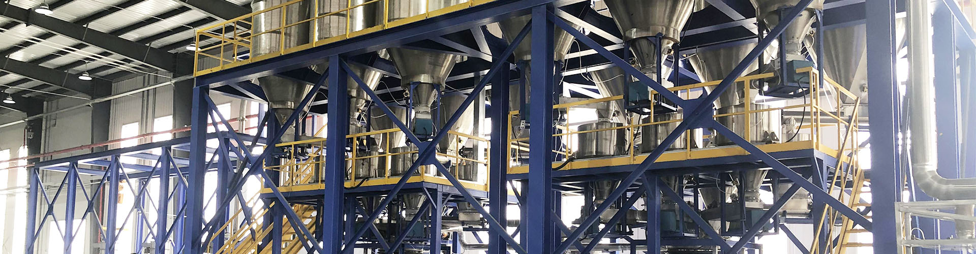 目前高壓密相係統的用途已經非常廣泛,針對長距離、大產量、多套使用的輸送場合與其他輸送工藝相比,正壓密相具有低能耗、更穩定的優勢。該方式常適用於較長的輸送管線距離及精細的、顆粒狀的、磨蝕性和非磨蝕性的及其它難於輸送的物料,如PVC粉、三元材料、納米碳酸鈣、彈性橡膠、麵粉、糖醇、白糖、奶粉、吸水樹脂、鋰電原材料等並且中間可以實現多種工藝的組合,如除鐵、過濾、幹燥、保壓、抽真空等。該係統主要由發送罐、輸送管線、管線增壓器、管道分路閥、末端排氣過濾裝置及智能電控部分等組成。